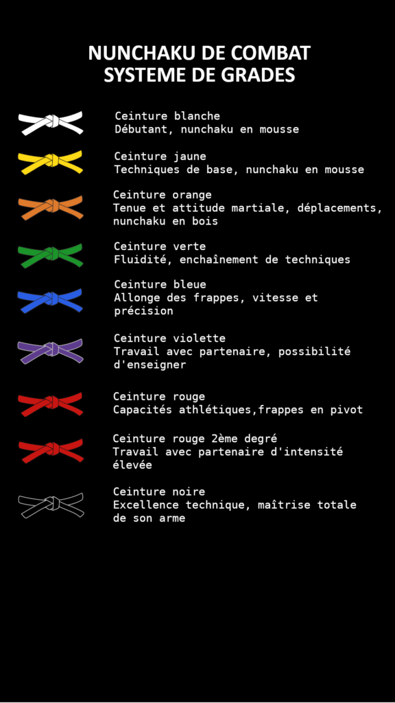 - Pour une ceinture jaune, énoncer les 3 principes du nunchaku de combat ou effectuer le kata des blocages